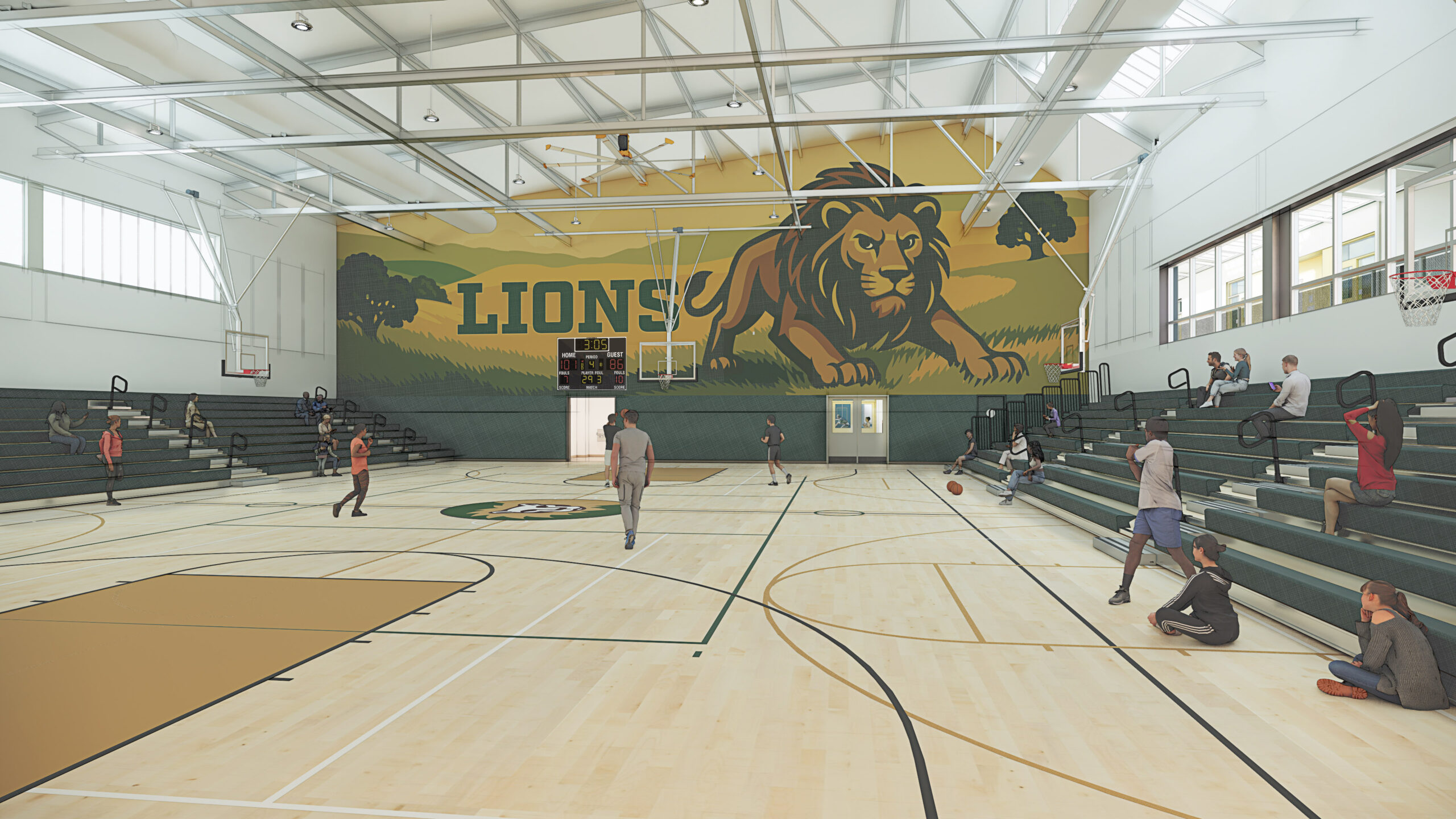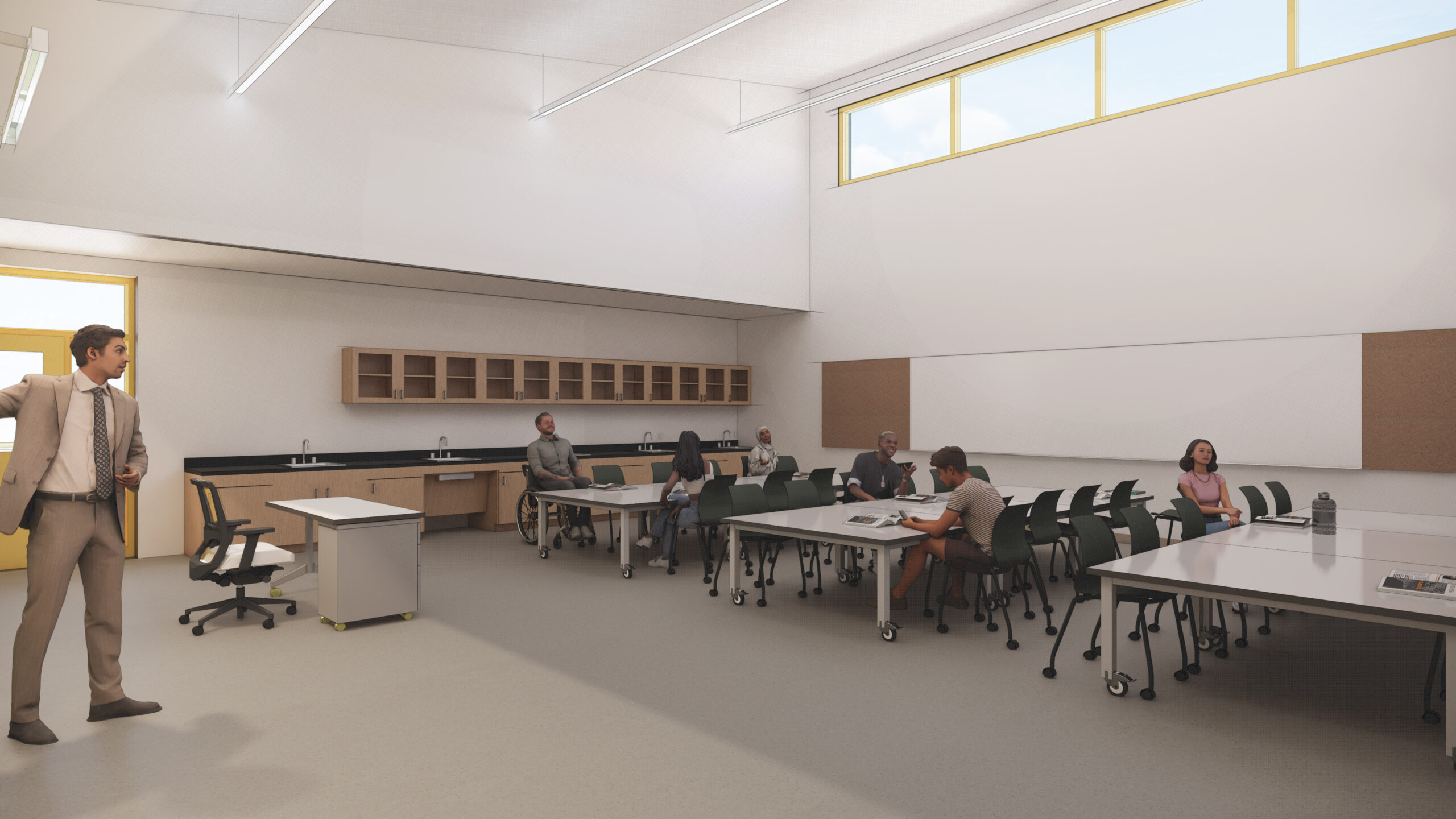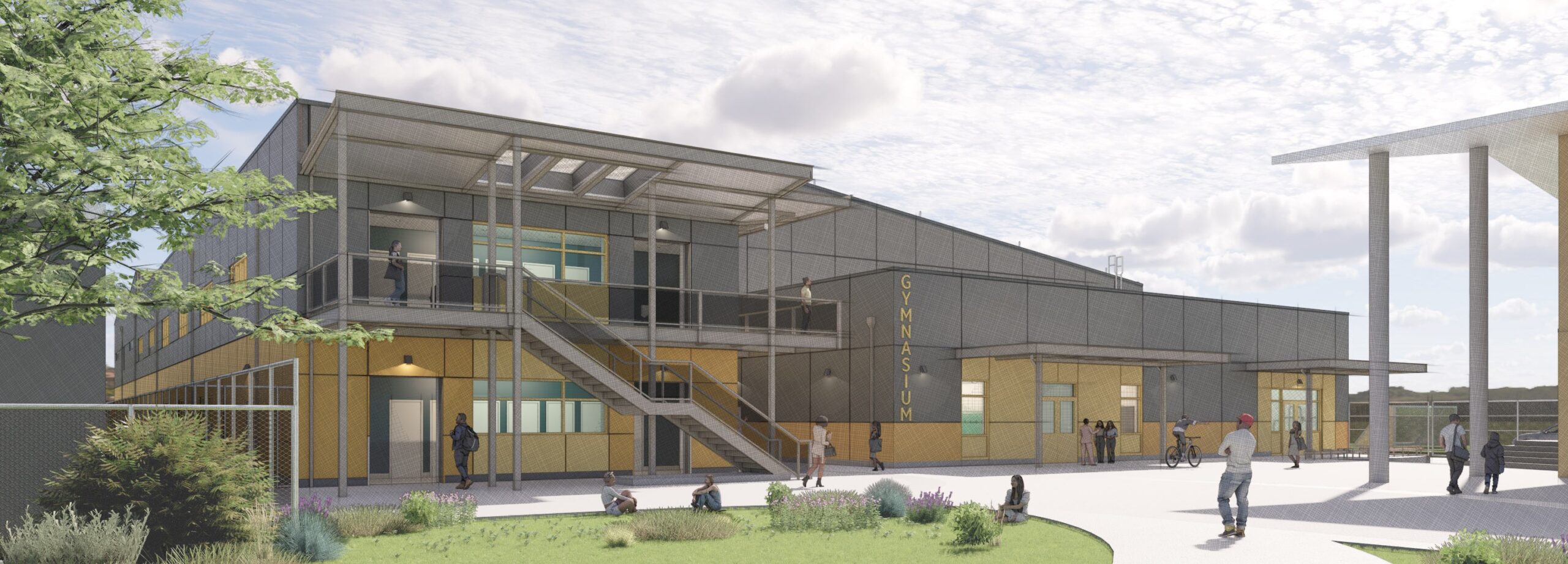 This progressive design-build project includes a new single-story gymnasium and a two-story classroom building with 14 standard classrooms and two specialized laboratory classrooms. The scope also includes reconfiguring the existing parking lot, upgrading campus infrastructure, demolishing the existing gymnasium, and creating enhanced outdoor spaces with new landscaping, seating, and activity areas.