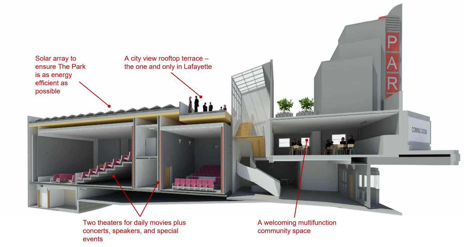 In 2019, local residents formed The Park Theater Trust—a 501(c)(3) public benefit organization—to restore the theater and reimagine it as an accessible hub for arts, entertainment, and culture. With a grant from the City of Lafayette and generous support from local businesses and families, construction is now in progress.  The project will feature two state-of-the-art theaters operated by CinemaSF, plus a community room, rooftop bar, concessions, and more.